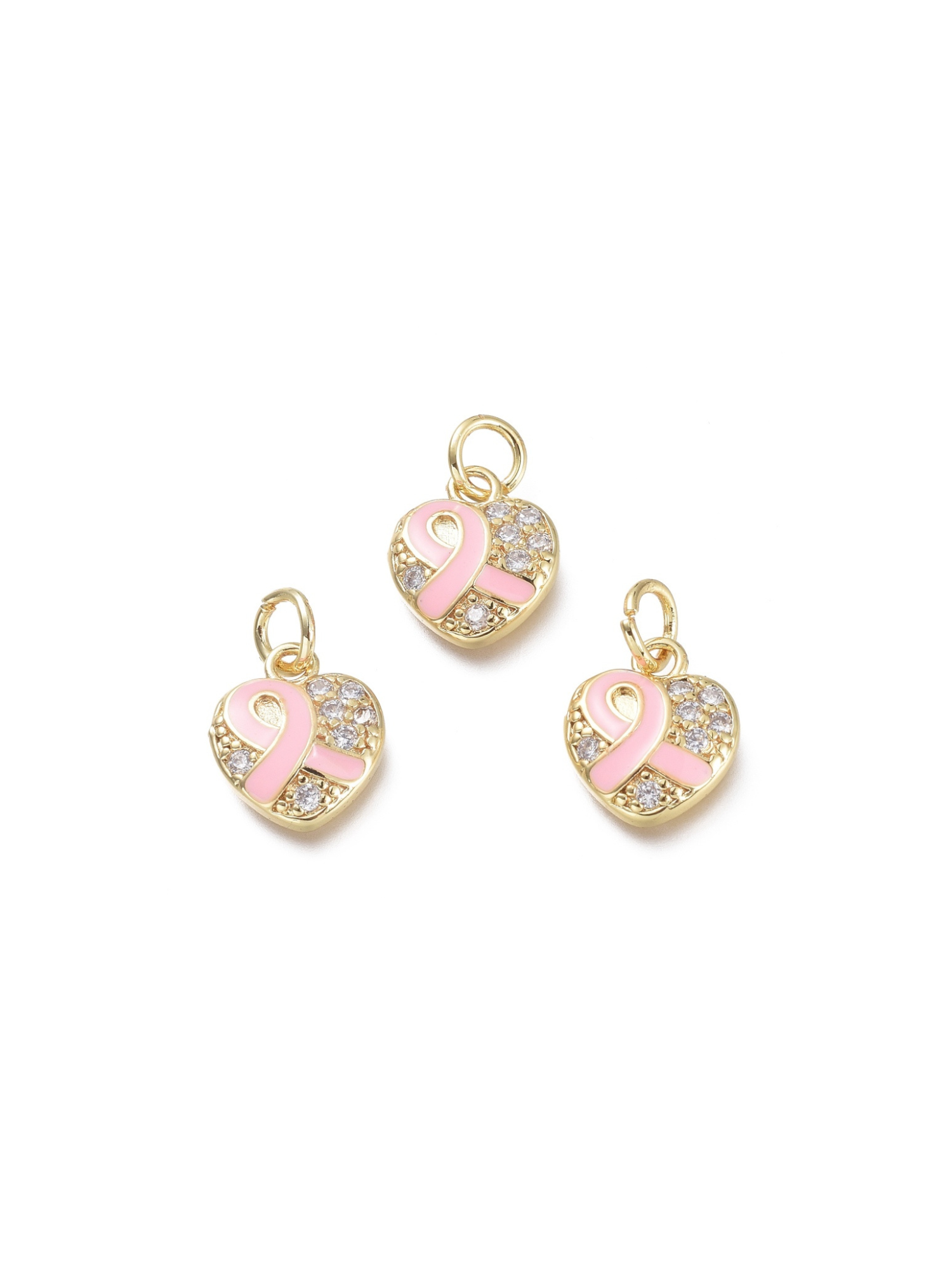 This breast cancer ribbon heart charm symbolizes strength and hope for those affected by breast cancer. Made with sparkling details, it serves as a beautiful reminder of the fight against this disease. Show your support and wear this charm with pride.