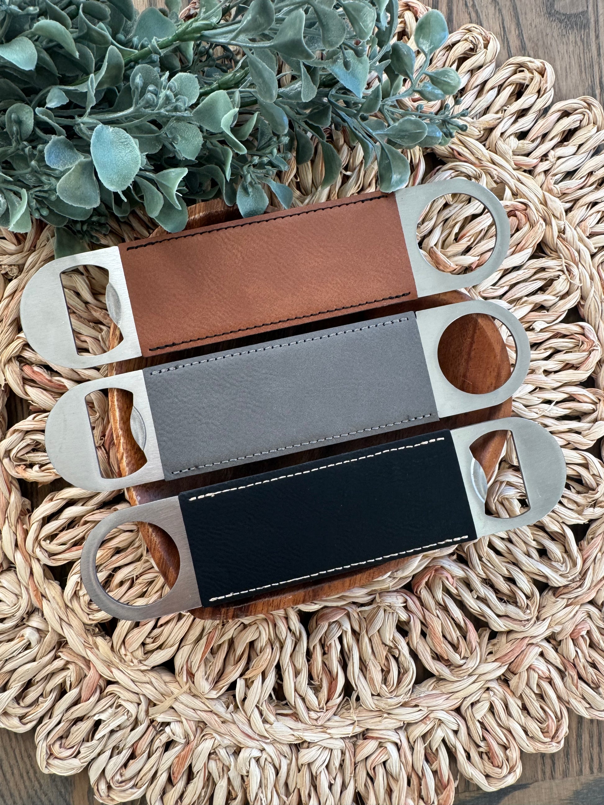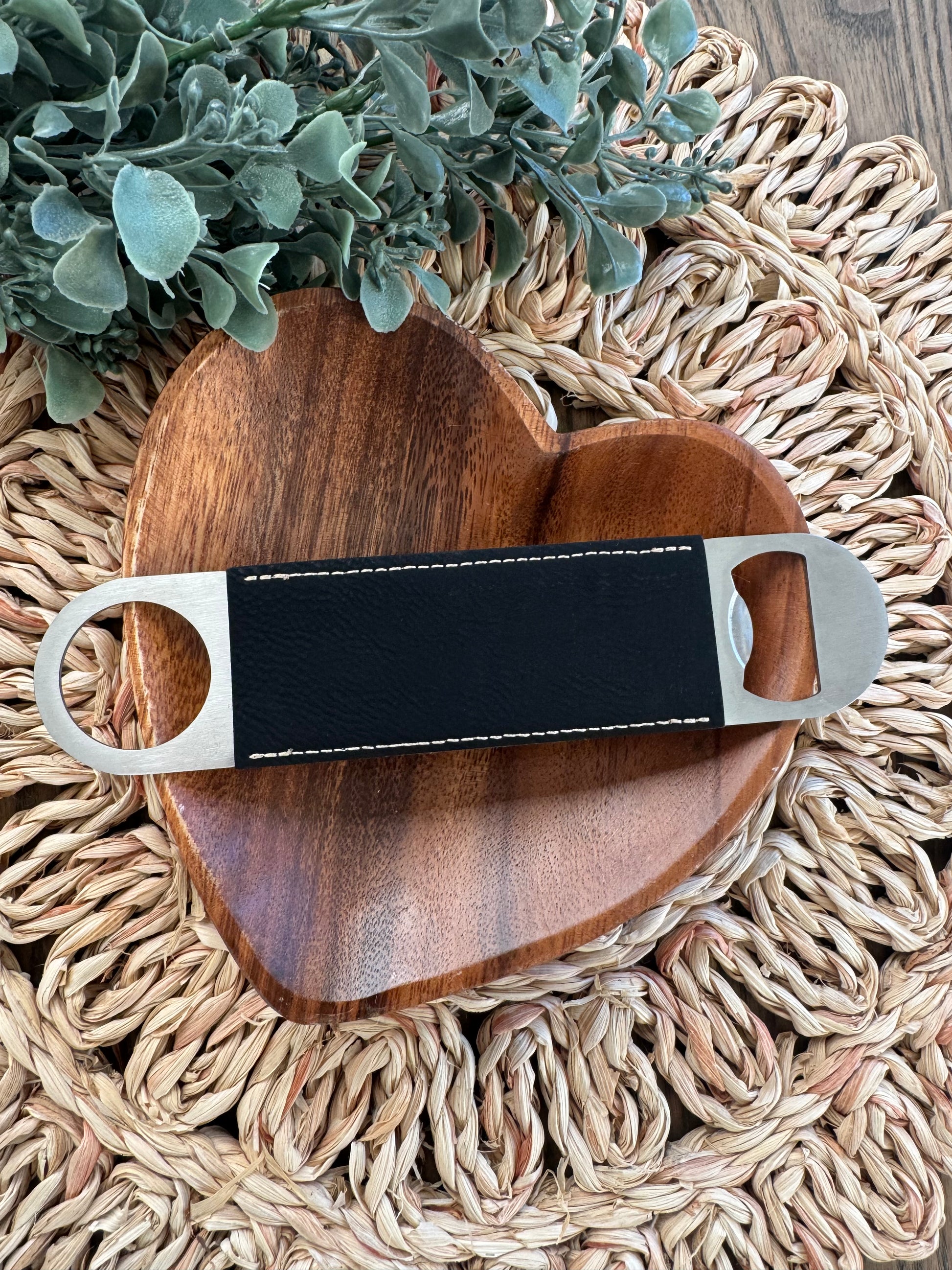 Upgrade your gifting (or your bar cart!) with our paddle-style laserable bottle opener, available in leatherette. Can be engraved with a name, message, logo, or design of your choice. Pair with a tea towel for a perfect, custom gift!