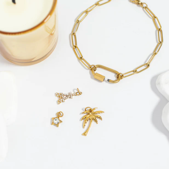 Crafted from high-quality stainless steel and finished in 18K gold PVD, it offers lasting shine and durability. Wear it solo, add charms to the carabiner, or layer it for a personalized look that stands out.