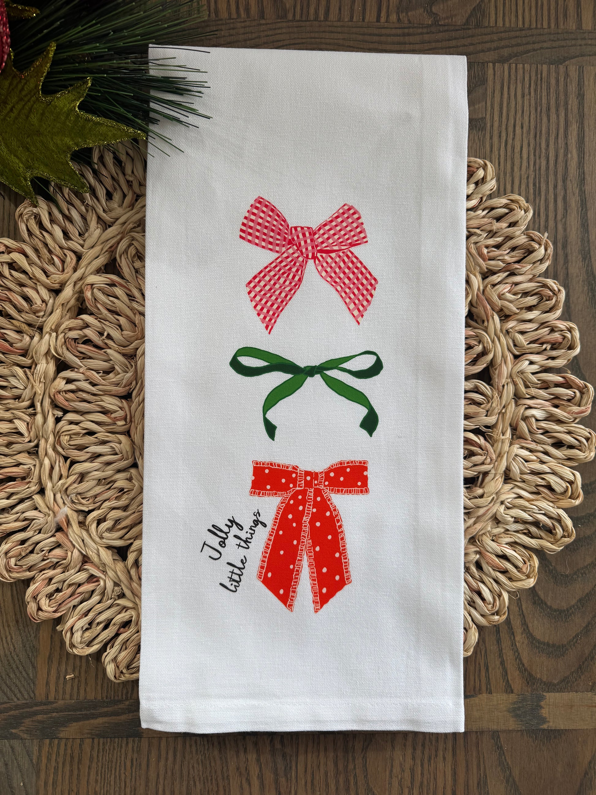 A sweet sprinkle of holiday cheer! This “Jolly Little Things” tea towel features a trio of charming bows—gingham, classic green, and a playful polka-dot red—making it the perfect cozy addition to your holiday kitchen décor.