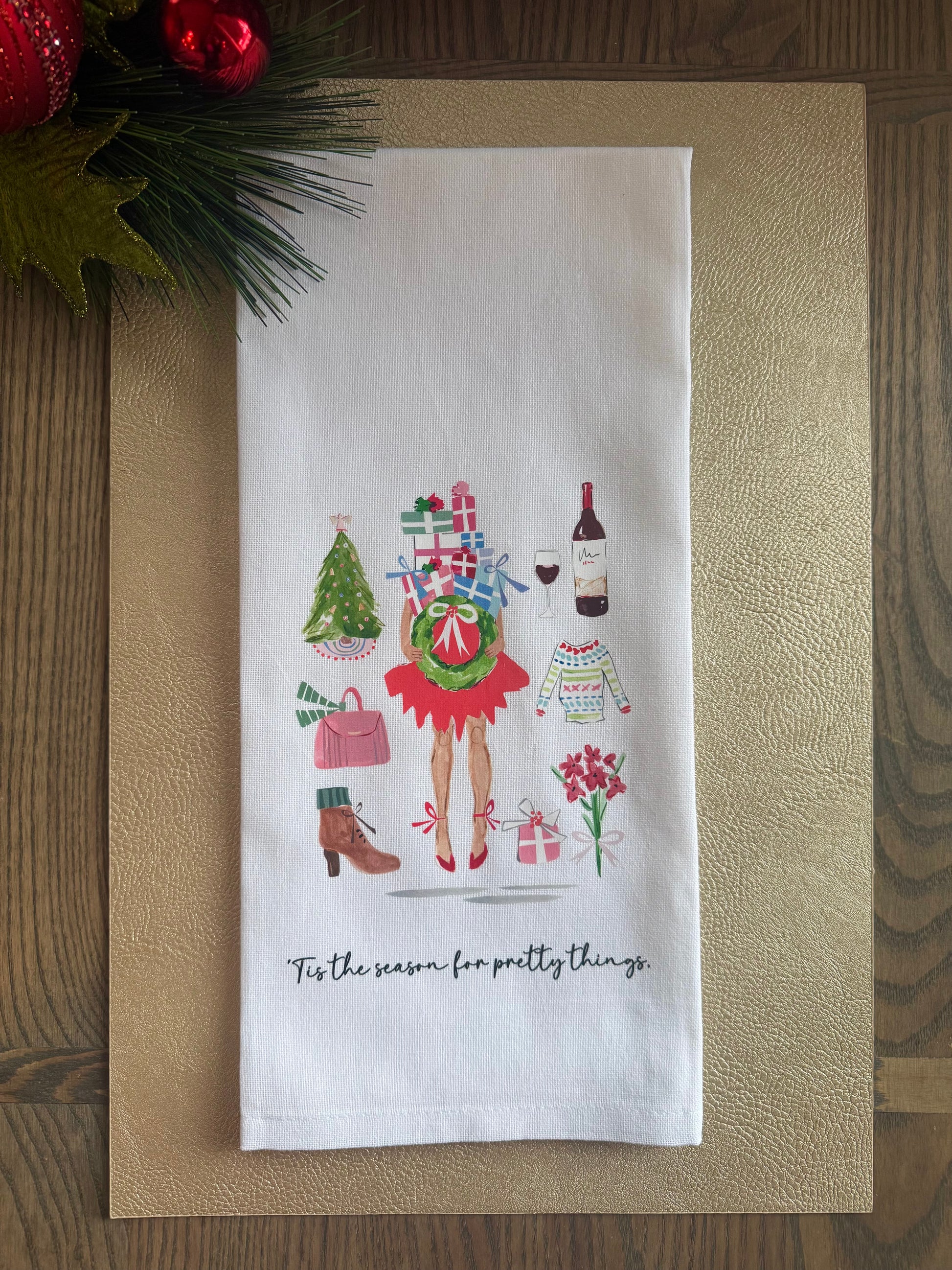 “’Tis the Season for Pretty Things” Christmas Tea Towel – Holiday Gifts, Wine & Tree Design – Festive Kitchen Decor